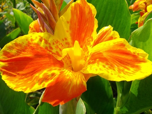 Канна Тарудант (Taroudant) - карликовый сорт с зеленой листвой. Цветы от 5 до 7 см в диаметре, ярко-оранжевого цвета с широкой желтой каймой. Высота – до 60см.Цветет с июня до заморозков.